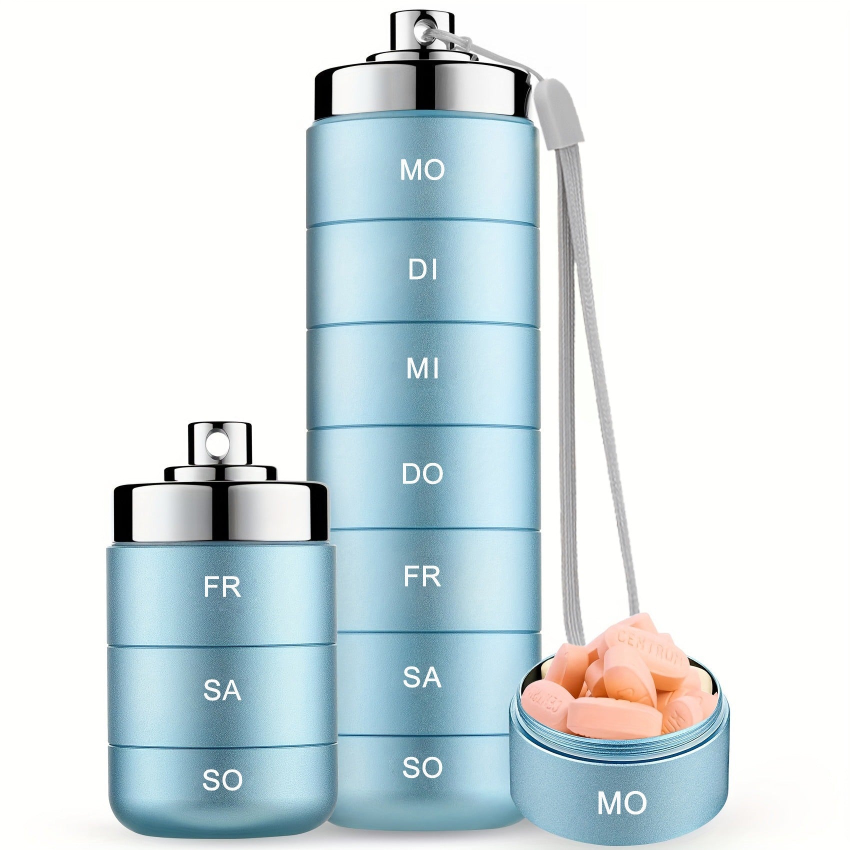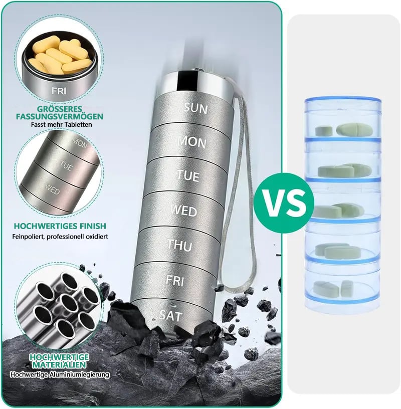 Hochwertiges medizinisches Metallmaterial: Anstelle von billigem Plastik besteht unsere Pillendose aus BPA-freiem, verstärktem und stoßfestem, robustem medizinischem Aluminium. Sie hält selbst einem Autoüberschlag stand. Verabschieden Sie sich von wackeligen Wochenpillenboxen aus Plastik und vermeiden Sie unerwartete Beschädigungen. Entscheiden Sie sich stattdessen für eine sichere und stabile Medikamentenbox.