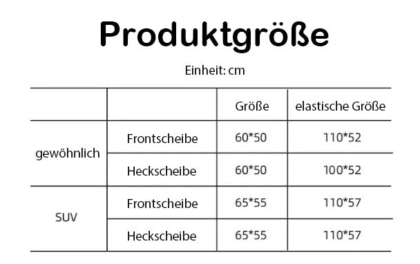 - Normale SUV-Heckscheibe: 65 x 55 cm / Dehnungslänge: 110 x 57 cm: